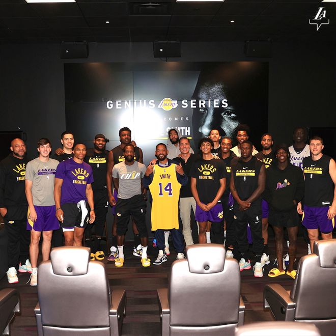输给开拓者两天后,湖人全队在训练馆集合,佩林卡告知球员会有一位特殊嘉宾来访——他打造了一个“天才系列”活动,邀请各领域名人(如“巨石”强森、肯德里克-拉马尔、埃隆-马斯克)来和球队交流,这次请来的是好莱坞一线明星威尔-史密斯(当时距离他在第94届奥斯卡掌掴克里斯-洛克仅过去6个月)。