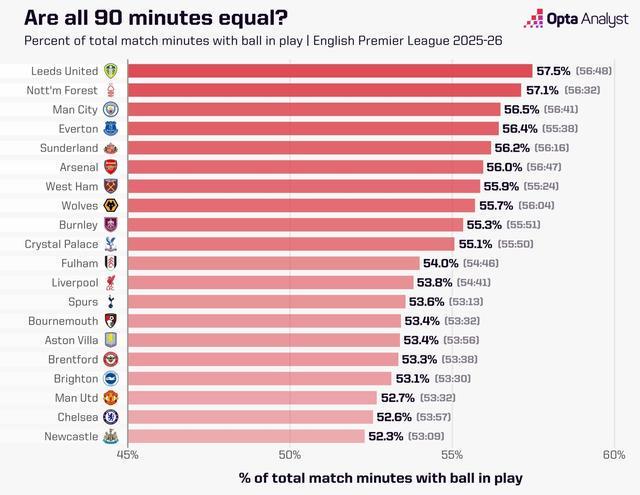 不过话说回来,有一场比赛的确在很大程度上拉低了纽卡斯尔的整体数据。纽卡斯尔在英超第2轮对阵利物浦的那场5球大战,是本赛季球在场上实际运行时间最少的一场比赛——这一点颇为惊人,因为整场比赛一共持续了109分24秒,是2025-26赛季英超所有比赛中时间第三长的。